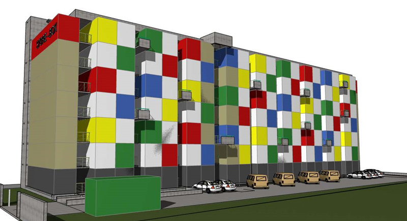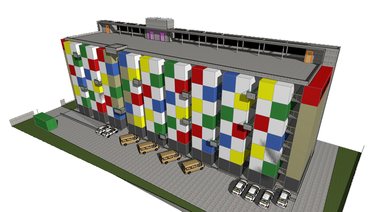 Edificio de 7 pisos de almacenaje con contenedores maritimos.